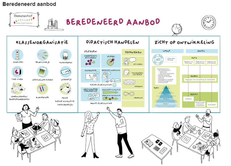 Effectief leesonderwijs op Donatushof kenmerkt zich door het in samenhang aanbieden van verschillende taalonderdelen binnen onze wereldoriëntatie, vormgegeven in kennisrijk thematisch onderwijs . Het betreft de aandacht voor technisch lezen (vlot en vloeiend lezen), leesbevordering en leesmotivatie, woordenschat en verdiepend lezen (door lezen, praten en schrijven de inhoud van een complexe tekst eigen kunnen maken).
